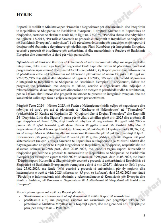 Në raportin e qeverisë mbi procesin e anëtarësimit dhe integrimit të Shqipërisë në BE për vitin 2025-2026, pasqyrohet objektivi për plotësimin e kushteve përmbyllëse për 10 kapituj brenda vitit 2026-2027.