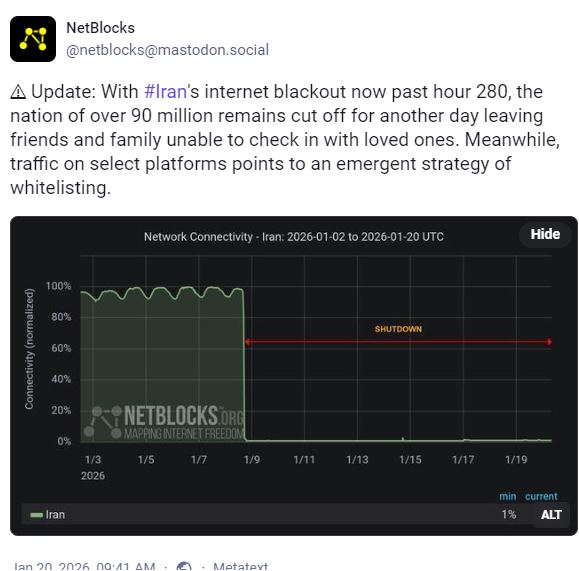 Blackout-i i internetit i vendosur nga autoritetet iraniane ka arritur të zgjasë më shumë se 280 orë, njofton organizata e pavarur për monitorimin e Internetit, Netblocks.