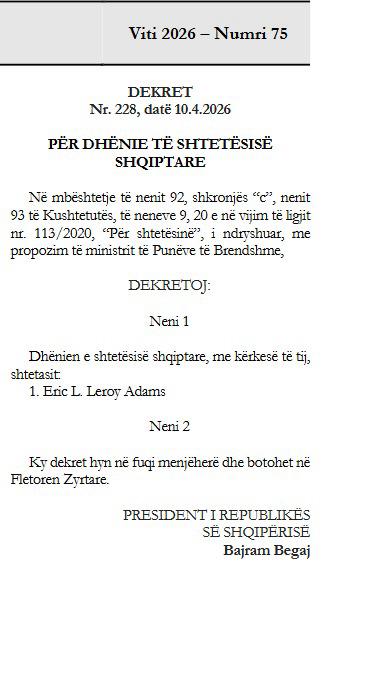 Vendimi për marrjen e shtetësisë prej tij është publikuar në fletoren zyrtare, pas dekretit të Presidentit Bajram Begaj.