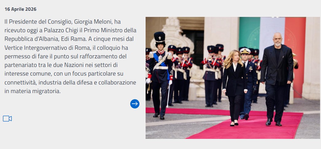 "Presidentja e Këshillit të Ministrave, Giorgia Meloni, priti sot në ‘Palazzo Chigi’ Kryeministrin e Republikës së Shqipërisë, Edi Rama. Pesë muaj pas Samitit Ndërqeveritar të Romës, takimi shërbeu për të bërë një bilanc të forcimit të partneritetit mes dy vendeve në sektorët me interes të përbashkët, me fokus të veçantë te ndërlidhja, industria e mbrojtjes dhe bashkëpunimi në fushën e emigracionit"