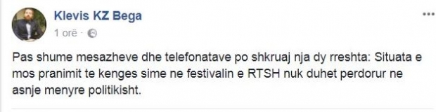 “Pas shumë mesazheve dhe telefonatave po shkruaj nja dy reshta: Situata e mos pranimit të këngës sime në festivalin e RTSH nuk duhet përdorur në asnjë mënyrë politikisht.”, ka shkruar këngëtari.