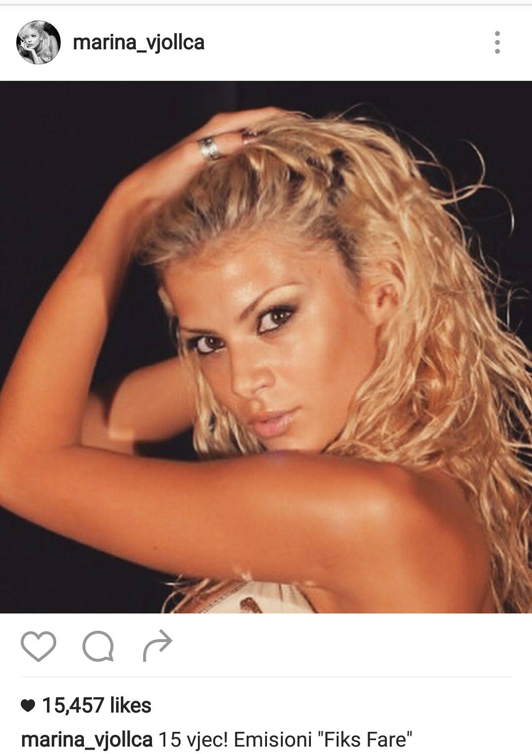 Marina Vjollca ka publikuar në instagram foto kur ajo ishte adoleshente. Në njërën foto tregon kur ishte 15-vjeç dhe punonte si velinë tek Fiks Fare ndërsa tek një tjetër në vitin 2007 kur ishte 17 vjeç.