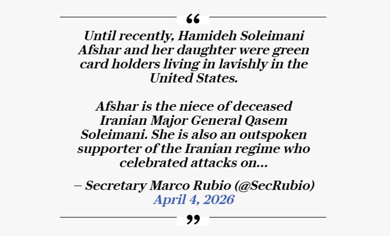 “Afshar është mbesa e gjeneralit të ndjerë iranian Qasem Soleimani. Ajo është gjithashtu një mbështetëse e zjarrtë e regjimit iranian, e cila ka festuar sulmet kundër amerikanëve dhe i është referuar vendit tonë si ‘Satanai i Madh’”, thotë Rubio.