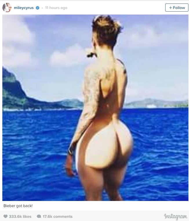 Justin Bieber duket se po kalon një fazë alla 'Miley Cyrus'. Bukuroshi 21 vjecar ka postuar një fotografi në Instagram teksa shijon pushimet në një jaht, pa mbathje dhe drejton shikimin e tij drejt një mali në anën tjetër.