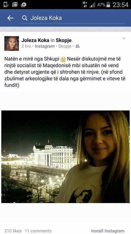 Kastro Zizo ka ironizuar një postim të Kryetares së FRESSH, duke iu kundërpërgjigjur me një postim të ngjashëm. Joleza Koka publikoi në Facebook një foto të shkrepur në Shkup, ku thoshte se në sfond ishin zbulimet e fundit arkeologjike duke iu referuar godinave të reja të ndërtuara në kuadër të projektit ‘Shkupi 2014’.