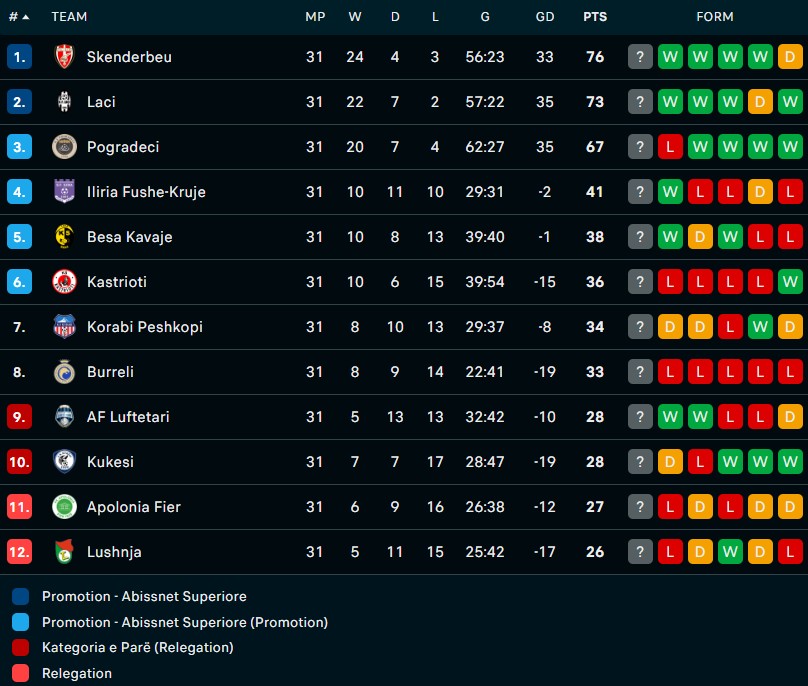 Kategoria e Parë e futbollit në Shqipëri zhvilloi këtë të dielë gjashtë ndeshjet e raundit të 31-të. Dy sfida nga fundi i sezonit janë mësuar edhe verdiktet e para, me Skënderbeun dhe Laçin që janë rikthyer zyrtarisht pas një viti në Superligë. Një vend në play-off e kanë të sigurt edhe Pogradeci me Ilirinë, ndërsa në dy raundet e fundit që kanë mbetur do ketë garë për titullin kampion, dy vendet e tjera në play-off, zonën play-out dhe sigurimin e mbijetesës.