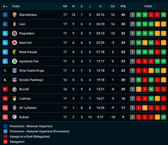 Pas javës së 17-të, Skënderbeu me 40 pikë mban vendin e parë, shtatë pikë më shumë se Laçi. Në zonën e promovimit ndodhen Pogradeci, Kastrioti, Besa dhe Apolonia. Në fund Burreli, Lushnja, AF Luftëtari dhe Kukësi.