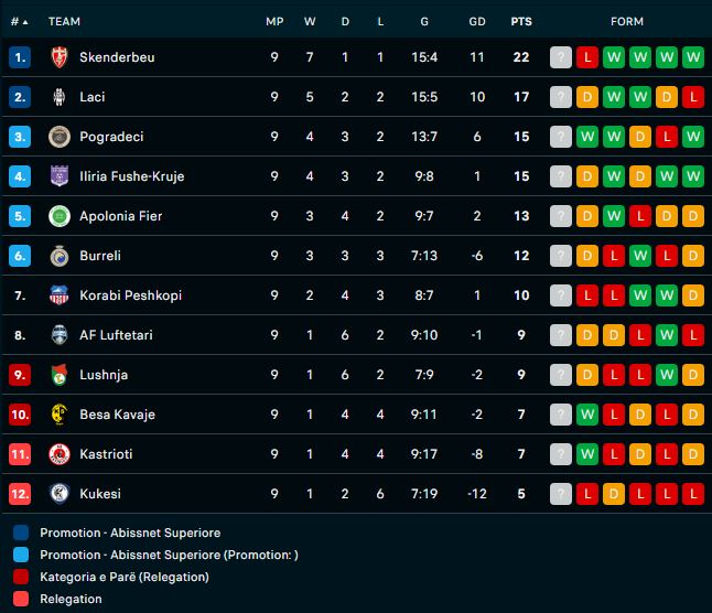 Pas javës së nëntë, Kategorinë e Parë e kryeson Skënderbeu me 22 pikë, ndjekur nga Laçi me 17-të. Në zonën e promovimit janë Pogradeci, Iliria, Apolonia dhe Burreli.