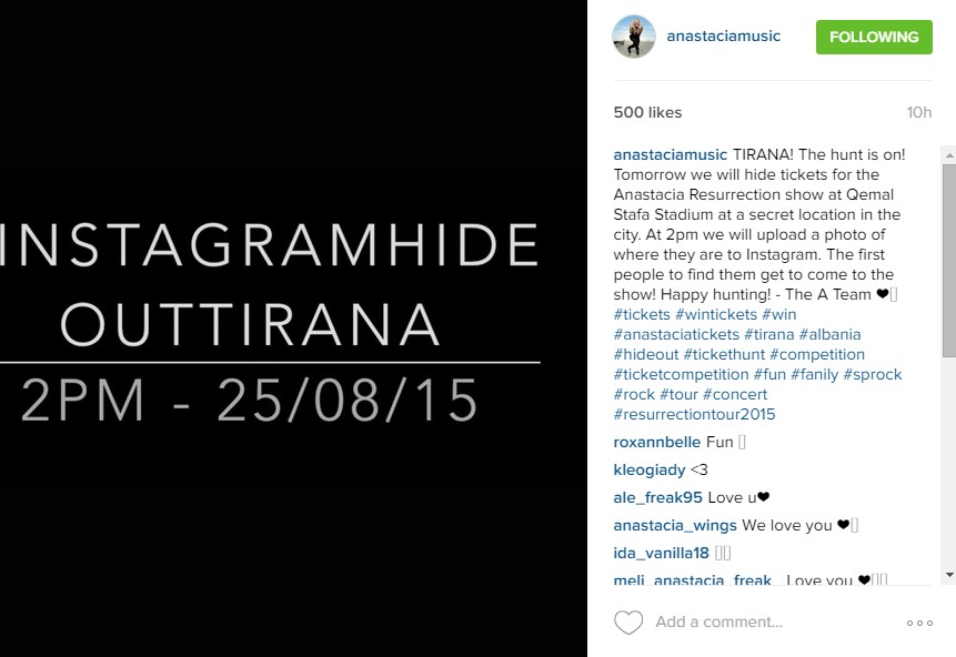 Një tjetër detaj interesant në lidhje me koncertin është edhe fshehja e dy biletave të koncertit në vende të ndryshme të Tiranës. Të orientuar përmes fotove qytetarët do të duhet ti gjejnë këto dy bileta duke fituar të drejtën për të qenë pjëse e koncertit në mbrëmje. Ka qenë vetë këngëtarja, e cila e ka postuar këtë lajm në Instagram përmes një fotoje.