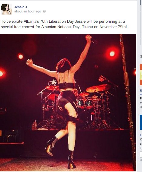 “Për të festuar 70-vjetorin e çlirimit në Shqipëri, Jessie J do të përformojë në një koncert special falas për ditën e festën e çlirimit të Shqipërisë më 29 nëntor,’-ka shkruar këngëtarja në faqen e saj zyrtare në Facebook.