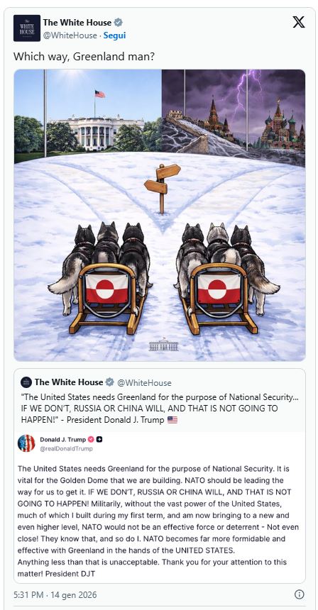 “Në cilën anë je, njeri i Groenlandës?”, thuhet në një imazh që paraqet dy slita tërhequr nga qen, si simbol i zgjedhjes përpara së cilës ndodhet Groenlanda: ose të rreshtohet me Shtetet e Bashkuara dhe të gëzojë një të ardhme që paraqitet si e ndritshme, ose të përballet me një stuhi të përfaqësuar nga forcat e përbashkëta të Rusisë dhe Kinës.