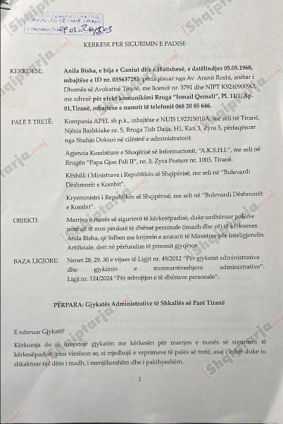 Aktorja e Teatrit Kombëtar, Anila Bisha, imazhi dhe zëri i së cilës, janë përshtatur për avatarin qeveritar, ka depozituar një sigurim të kërkesëpadisë në Gjykatën Administrative ku si palë janë Këshilli i Ministrave, Kompania Apel shpk, AKSHI dhe kryeministri Edi Rama.