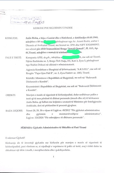 Përmes një kërkese për sigurim padie, aktorja kërkon që deri në përfundimin e shqyrtimit gjyqësor, të mos përdoren të dhënat e saj personale (imazh dhe zë), për avatarin e Ministres për Inteligjencën Artificiale. Aktorja Bisha pretendon se po i shkaktohet një dëm i madh dhe i pakthyeshëm.