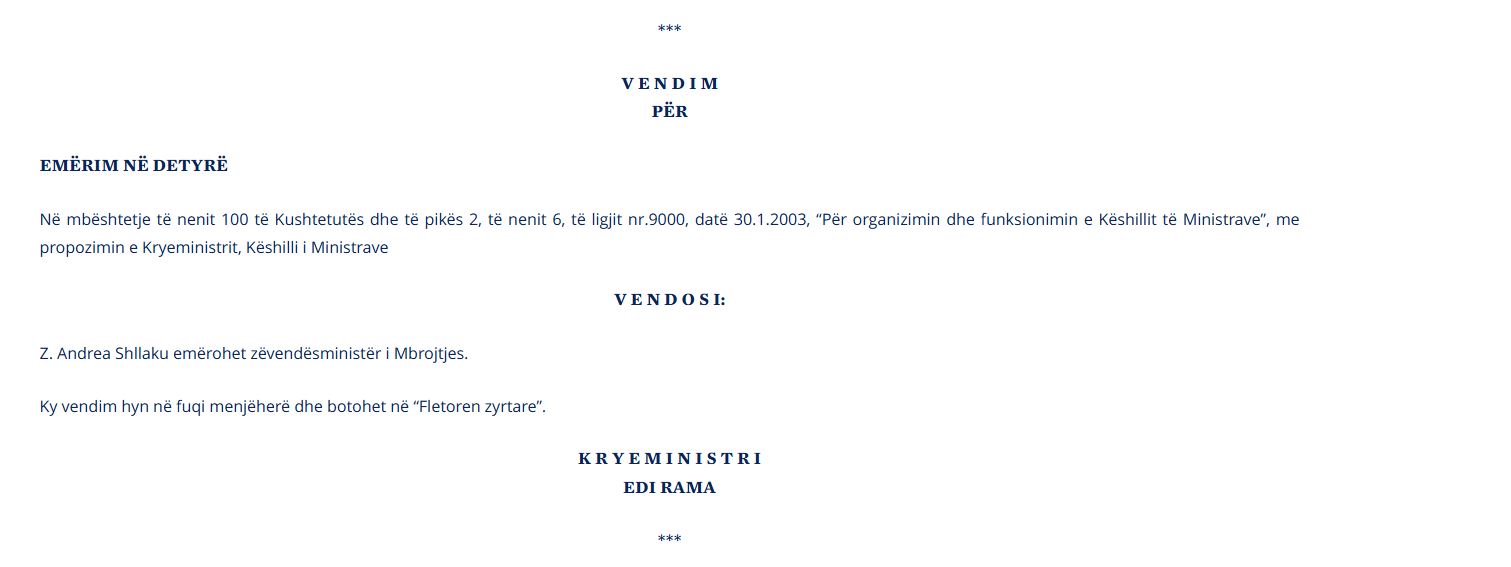Këshilli i Ministrave ka emëruar në mbledhjen e 19 dhjetorit Andrea Shllakun si zëvendësministër të Mbrojtjes.