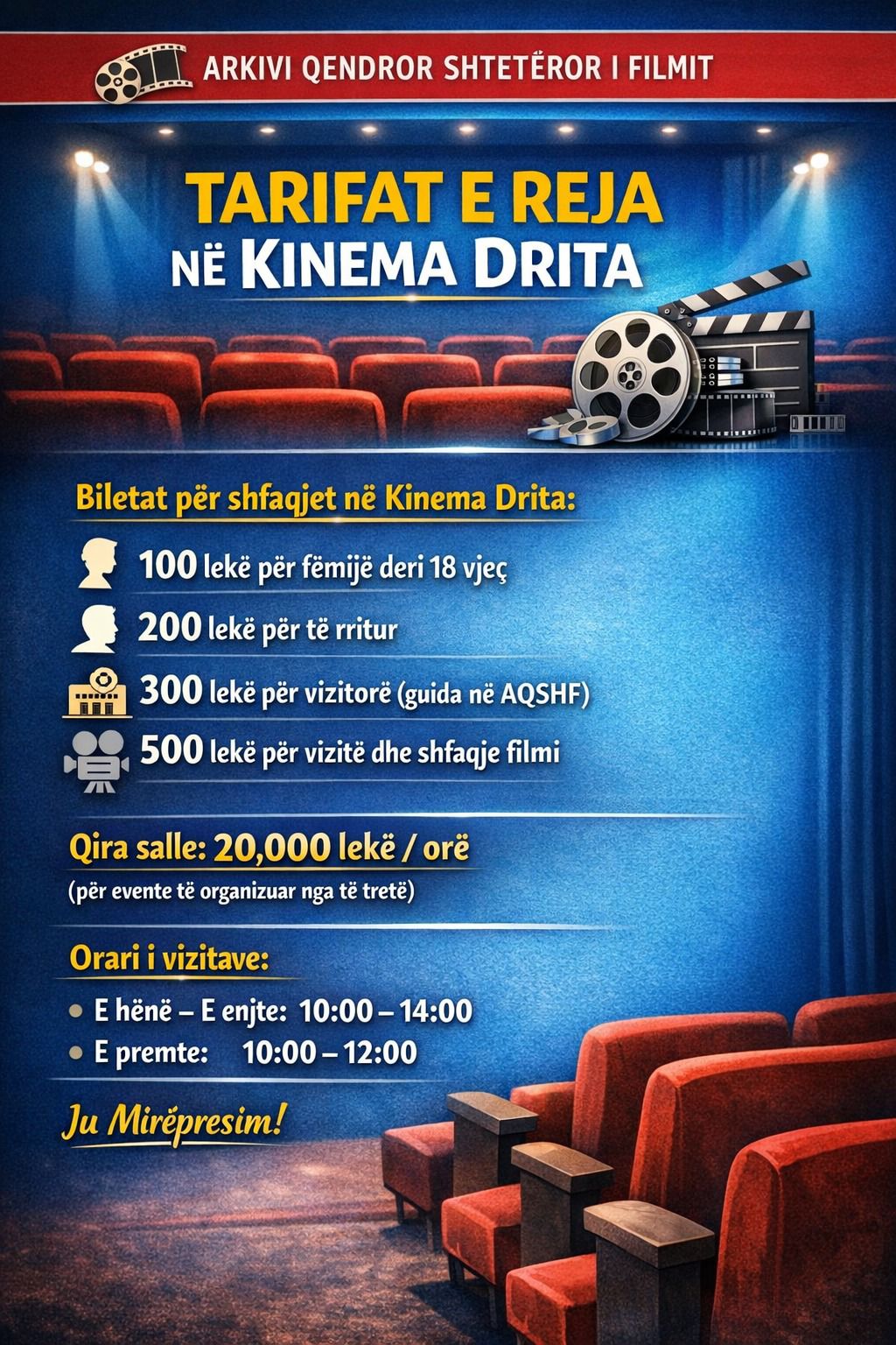 “Arkivi Qendror Shtetëror i Filmit njofton sistemin e ri të tarifave, që vendoset për herë të parë, për vizitorët dhe publikun që ndjek shfaqjet në këtë kinema.”, thuhet në një njoftim nga AQSHF.