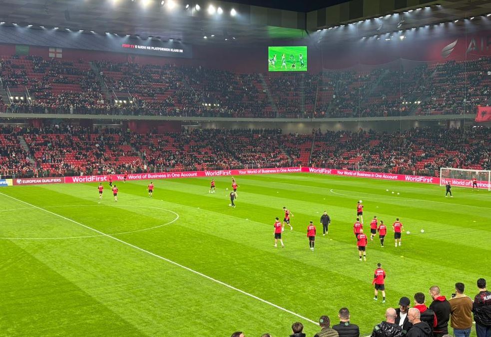 Me duartrokitje dhe brohorima është pritur ekipi i Shqipërisë gjatë daljes për nxehmjen e zakonshme para ndeshjes kundër Anglisë. Tifozët po vijojnë të mbushin stadiumin 'Air Albania', teksa gjithë biletat janë shitur (22 mijë).
