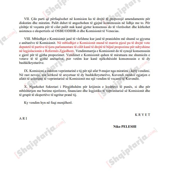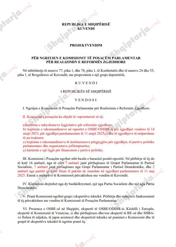 Komisioni i posaçëm parlamentar me 16 anëtarë, 8+8, mes tyre dy bashkëkryetarët me të drejtë vetoje, pritet të ngrihet në seancën plenare në Kuvend më 27 tetor dhe pritet të bashkëdrejtohet nga Damian Gjiknuri dhe Oerd Bylykbashi, me një afat pune, 9 muaj.