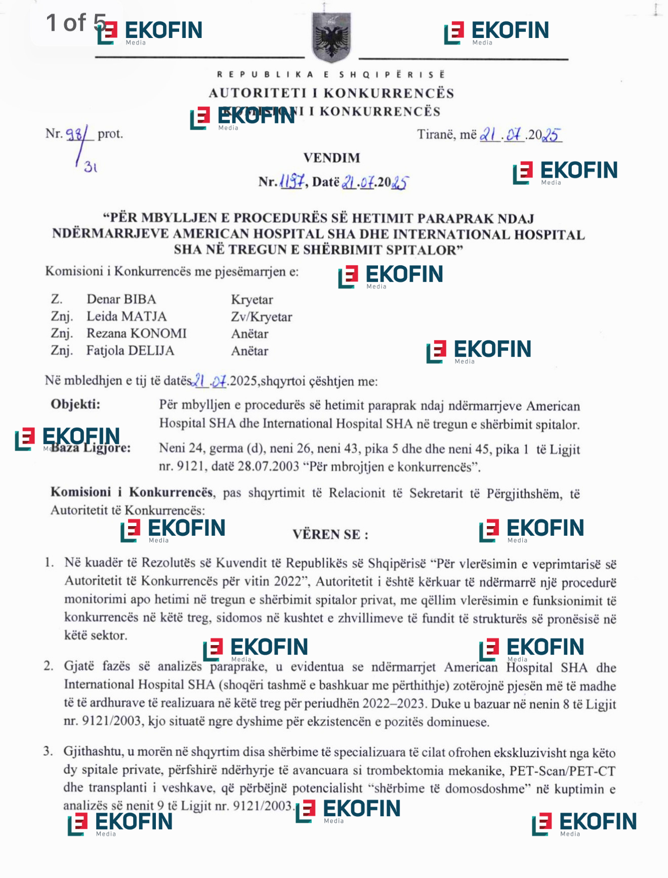 Autoriteti i Konkurrencës ka vendosur të mbyllë hetimin paraprak ndaj dy prej aktorëve më të mëdhenj të tregut privat spitalor në vend, American Hospital, i njohur ndryshe si Spitali Amerikan dhe International Hospital ose siç njihet më mirë Spitali Hygeia (të  dy spitalet të Klodian Allajbeut), por mënyra se si është trajtuar ky proces ngre më shumë pikëpyetje sesa përgjigje. Vendimi për hapjen e hetimit paraprak u mor në prill 2025. Ndërsa vendimi për mbylljen e procedurës, të cilin e konsultoi ekofin.al është marrë në korrik 2025, por është bërë publik vetëm së fundmi në faqen zyrtare të Autoritetit të Konkurrencës, duke vënë në diskutim serioz transparencën dhe llogaridhënien e këtij autoriteti ndaj publikut dhe tregut.