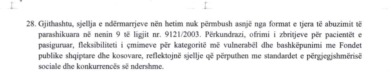 Megjithatë, në një kthesë që e bën të gjithë analizën kontradiktore, Autoriteti i Konkurrencës arrin në përfundimin se, pavarësisht kësaj pozite dominuese, nuk ka prova për sjellje abuzive. Argumenti kryesor është se çmimet për shërbimet e mbuluara nga Fondi i Sigurimit të Detyrueshëm të Kujdesit Shëndetësor janë transparente dhe të barabarta për pacientët, ndërsa vetë ndërmarrjet kanë aplikuar edhe politika fleksibile çmimesh dhe zbritje për kategori të caktuara pacientësh.