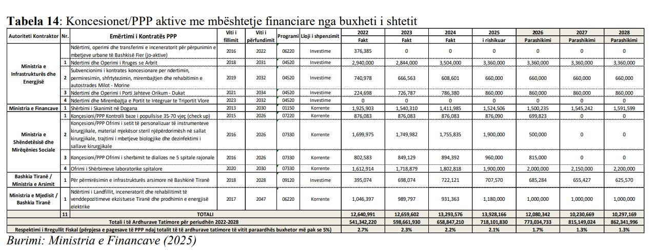 Në pr.buxhetin për vitin 2026 janë është parashikuar që 120 mln euro të shkojnë për kontratat koncesionare. Aktualisht, në pr.buxhet theksohet se janë aktive 11 kontrata koncesionare apo partneriteti publik privat (PPP).