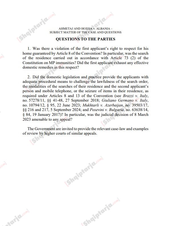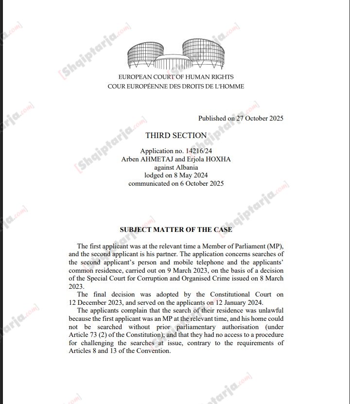 “Kërkuesi i parë ishte në kohën përkatëse një Anëtar i Parlamentit (AP), dhe kërkuesja e dytë është partnerja e tij. Kërkesa ka të bëjë me kontrollin e kryer më 9 mars 2023 ndaj personit dhe telefonit celular të kërkueses së dytë dhe banesës së përbashkët të kërkuesve, mbi bazën e një vendimi të Gjykatës së Posaçme për Korrupsionin dhe Krimin e Organizuar, të lëshuar më 8 mars 2023.