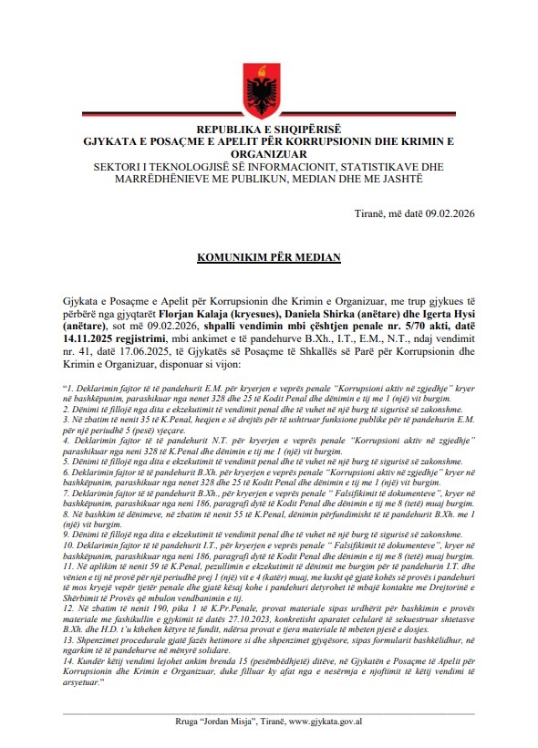 TIRANË- Apeli i GJKKO-së ka lënë në fuqi dënimin me 1 vit burg për kryebashkiakun socialist të Rrogozhinës, Edison Memolla. I pari i Rrogozhinës është shpallur fajtor për korrupsion në zgjedhjet e pjesshme të të 6 marsit 2022 ku ai kandidonte nën siglën e socialistëve, ku edhe rezultoi fitues.