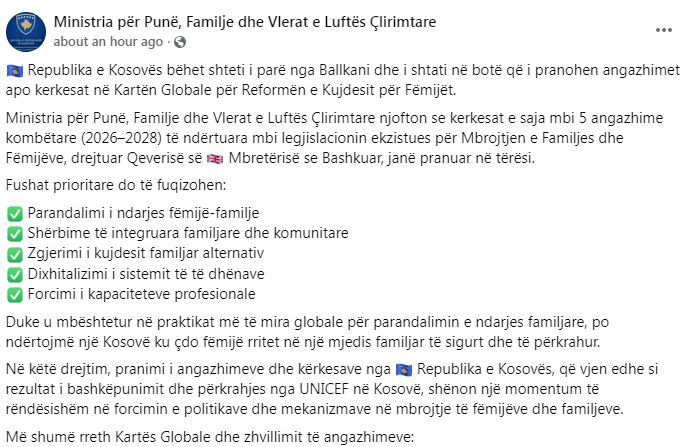 Lajmi është bërë i ditur nga Ministria për Punë, Familje dhe Vlerat e Luftës Çlirimtare përmes një komunikate për media e cila thekson se kërkesat e saj mbi 5 angazhime kombëtare (2026–2028) të ndërtuara mbi legjislacionin ekzistues për Mbrojtjen e Familjes dhe Fëmijëve, drejtuar Qeverisë së ?? Mbretërisë se Bashkuar, janë pranuar në tërësi.