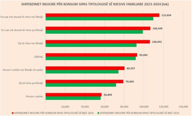 Një familjeje të tillë i duhen 106 mijë lekë në muaj për të përballuar jetesën (rreth 14 mijë lekë më shumë se një vit më parë), nga 93 mijë lekë në muaj që është mesatarja. Kjo tregon se familjet me fëmijë janë përballur me rritje të ndjeshme të kostove, për ushqim, arsim, energji apo transport.