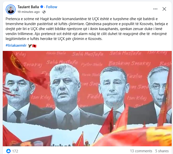 “Pretenca e sotme në Hagë kundër komandantëve të UÇK është e turpshme dhe një batërdi e tmerrshme kundër pastërtisë së luftës çlirimtare. Qëndresa paqësore e popullit të Kosovës, beteja e drejtë për liri e UÇK dhe valët biblike njerëzore që i iknin kasaphanës, qenkan zeruar duke i lenë vendin trillimeve. Ajo pretencë sot është një alarm ndaj të cilit duhet të reagojmë dhe të mbrojmë legjitimitetin e luftës heroike të UÇK për çlirimin e Kosovës”, thuhet në reagimin e tij në Facebook