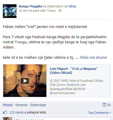 Në shkrim është postuar edhe linku i këngës së këngëtarit Luis Miguel me titull “O tu o Ninguna”, e kopjuar identik nga kompozitori Fabjan Asllani.