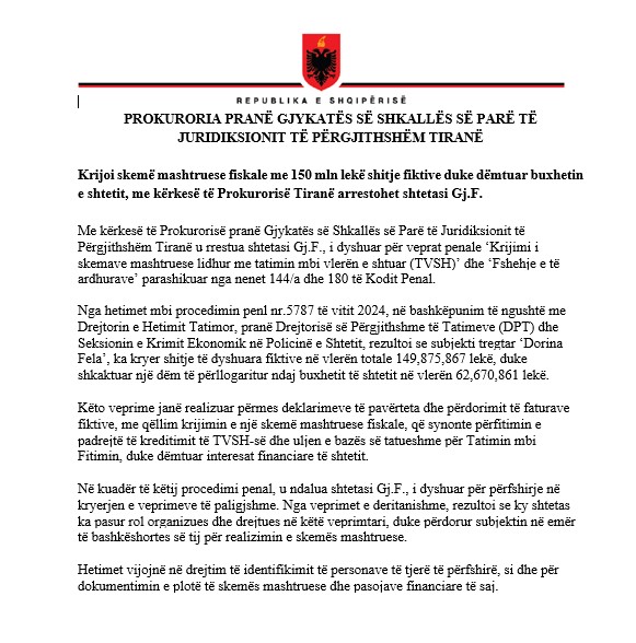 Me kërkesë të Prokurorisë pranë Gjykatës së Shkallës së Parë të Juridiksionit të Përgjithshëm Tiranë u rrestua shtetasi Gj.F., i dyshuar për veprat penale ‘Krijimi i skemave mashtruese lidhur me tatimin mbi vlerën e shtuar (TVSH)’ dhe ‘Fshehje e të ardhurave’ parashikuar nga nenet 144/a dhe 180 të Kodit Penal.