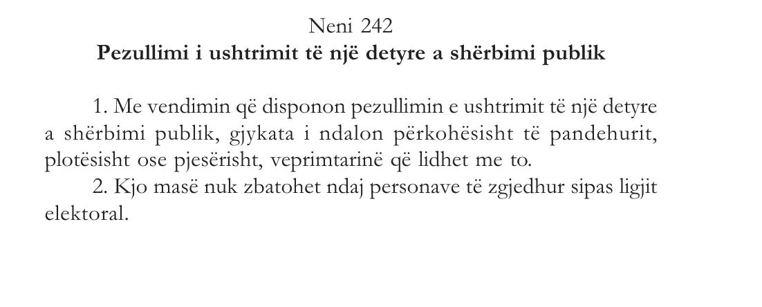 1. Funksionet e padelegueshme kushtetuese, nga ai i anëtarit të qeverisë tek ai i Presidentit të Republikës dhe jo vetëm, nuk mund të pezullohen kurrësesi nga askush duke u nisur nga një emër përveçëm, sepse pezullimi paralizon funksionin, pra institucionin që ai/ajo drejton.