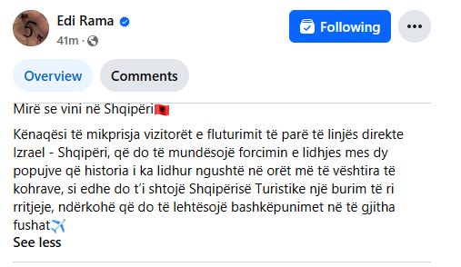 “Mirë se vini në Shqipëri! Kënaqësi të mikprisja vizitorët e fluturimit të parë të linjës direkte Izrael - Shqipëri, që do të mundësojë forcimin e lidhjes mes dy popujve që historia i ka lidhur ngushtë në orët më të vështira të kohërave, si edhe do t’i shtojë Shqipërisë Turistike një burim të ri rritjeje, ndërkohë që do të lehtësojë bashkëpunimet në të gjitha fushat”, u shpreh kryeministri me një video-postim në rrjetin social Facebook sot (2 prill).