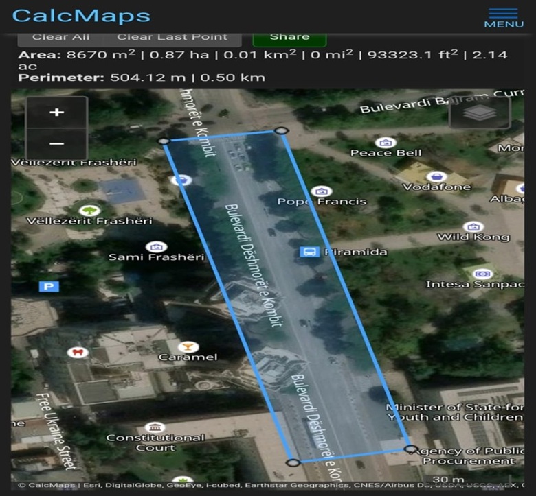 Le t’i referohemi CalcMaps (shihni hartën e mëposhtme), për të llogaritur se sa është sipërfaqja ku ishin shpërndarë kokrra-kokrra protestuesit e thirrur nga Berisha. Nga tribuna e Berishës deri tek Lana (duke përfshirë edhe trotuaret), sipërfaqja e përgjithshme rezulton 8670 m2.