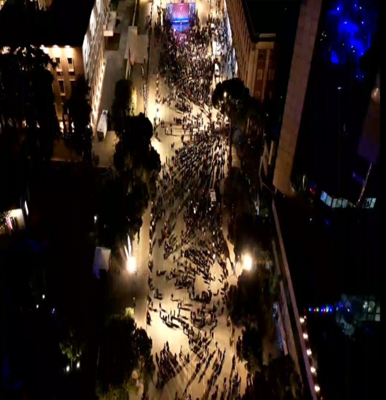 Në qoftë se në këtë sipërfaqe do të ishin ngjeshur 4 protestues për metër katror (si në një ashensor të vogël me përmasa 1x1 m), në total do të ishin rreth 35 mijë pjesëmarrës në protestë. POR NË FAKT, dendësia MESATARE ishte diku te 1 protestues për 5 metra katror (shihni me poshtë pamjen me dron, që tregon se pranë tribunës dhe Kullave Binjake kishte një farë dendësie, kurse kudo tjetër kishte vetëm rrallësi).