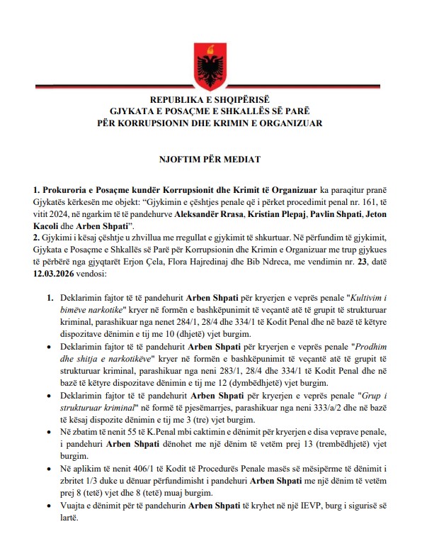 TIRANË- Gjykata e Posaçme ka dënuar me 59 vite e 6 muaj burg 6 anëtarë të një grupi kriminal të cilët mbushën Shkodrën me kanabis. Ky grup u godit në vitin 2023 dhe kishin kultivuar 10 mijë rrënjë kanabisi në fshatrat Kir dhe Pult.