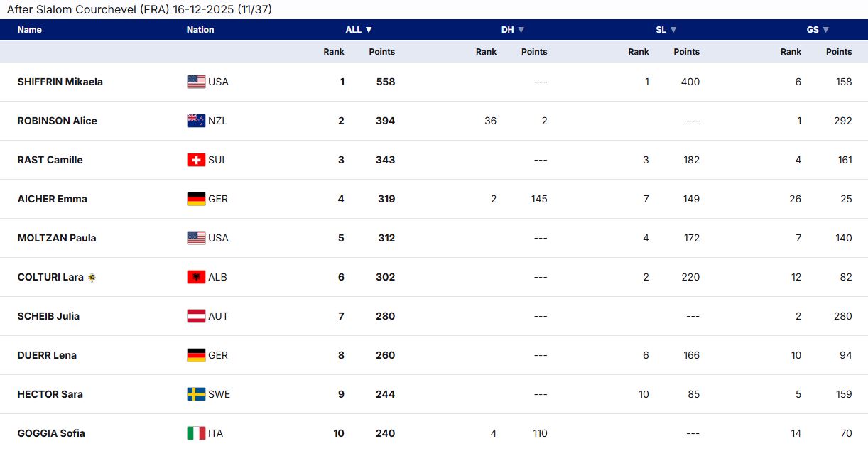 Në krye të renditjes vijon të qëndrojë Mikaela Shiffrin, e cila triumfoi edhe në garën e fundit në Courchevel dhe kryeson me 558 pikë, e ndjekur nga Alice Robinson me 394 pikë.