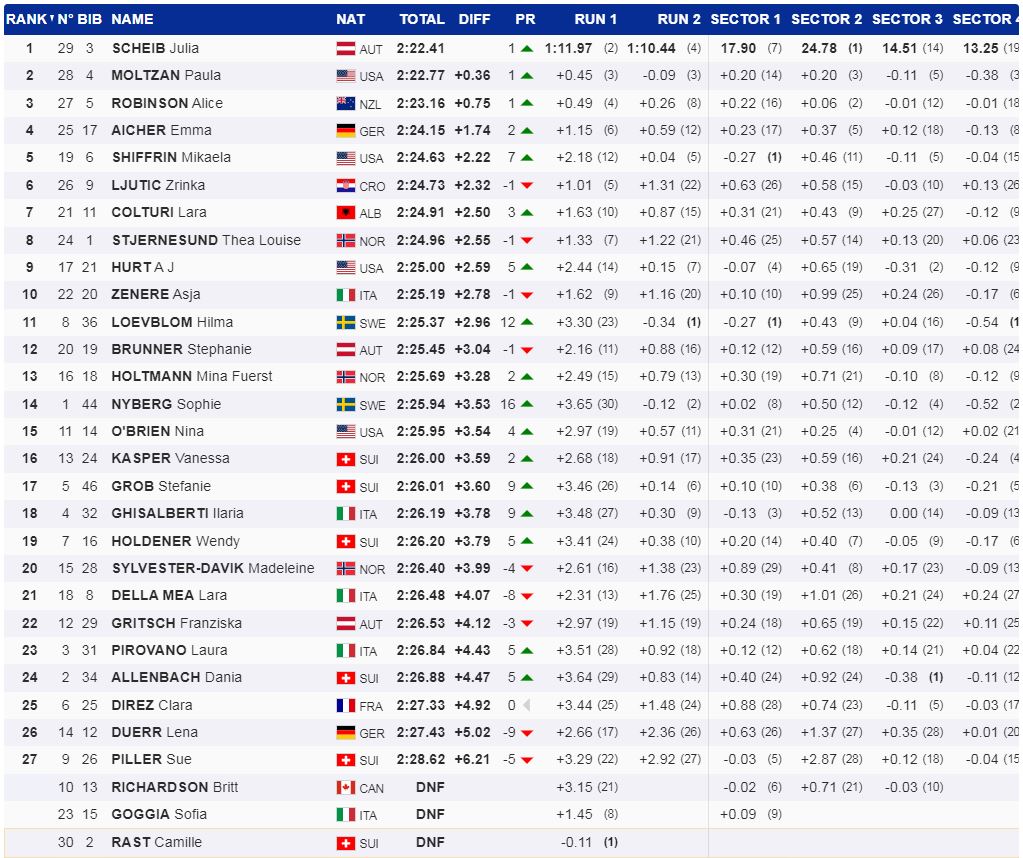 Në garën e Slalomit Gjigant triumfoi policja nga Austria, Julia Scheib me kohën 2 minuta 22 sekonda e 41 të qindtat, duke lënë pas amerikanen Paula Moltzan dhe neo-zelandezen Alice Robinson. Zvicerania Camille Rast, e cila kishte kohën më të mirë në lëshimin e parë, nuk mundi të mbyllte lëshimin e dytë duke dalë jashtë pistës dhe humbur mundësinë për një vend në podium, pse jo edhe trofeun e kampiones. Në fund lot për të.