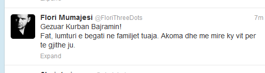“Urime Festën e Kurban Bajramit të gjithë besimtarëve mysliman. Fati, mbarësia, paqja dhe lumturia gjithmonë ju shoqëroftë në jetët tuaja,”- ka uruar këngëtarja Genta Ismaili në Twitter.