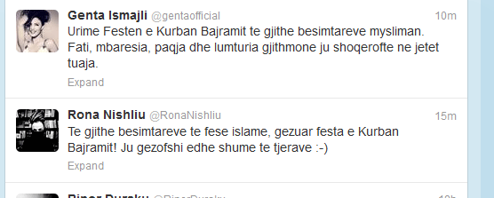 Besimtarët e fesë myslimane festojnë sot ditën e Kurban Bajramit. Gjatë kësaj dite feste nuk mund të mungonin edhe urimet e personazheve të njohur shqiptar dhe kosovar të cilët kanë shfrytëzuar hapësirat që ofrohen prej rrjeteve sociale si Facebook dhe Twitter për të shprehur urimet e tyre.