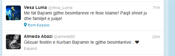 Besimtarët e fesë myslimane festojnë sot ditën e Kurban Bajramit.  Gjatë kësaj dite feste nuk mund të mungonin edhe urimet e personazheve të njohur shqiptar dhe kosovar të cilët kanë shfrytëzuar hapësirat që ofrohen prej rrjeteve sociale si Facebook dhe Twitter për të shprehur urimet e tyre.