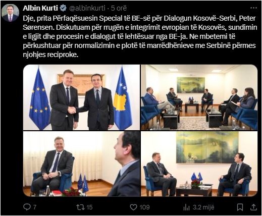 “Dje, prita Përfaqësuesin Special të BE-së për Dialogun Kosovë-Serbi, Peter Sørensen. Diskutuam për rrugën e integrimit evropian të Kosovës, sundimin e ligjit dhe procesin e dialogut të lehtësuar nga BE-ja. Ne mbetemi të përkushtuar për normalizimin e plotë të marrëdhënieve me Serbinë përmes njohjes reciproke”, ka shkruar Kurti.
