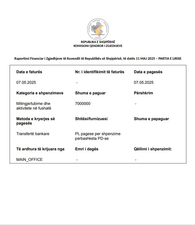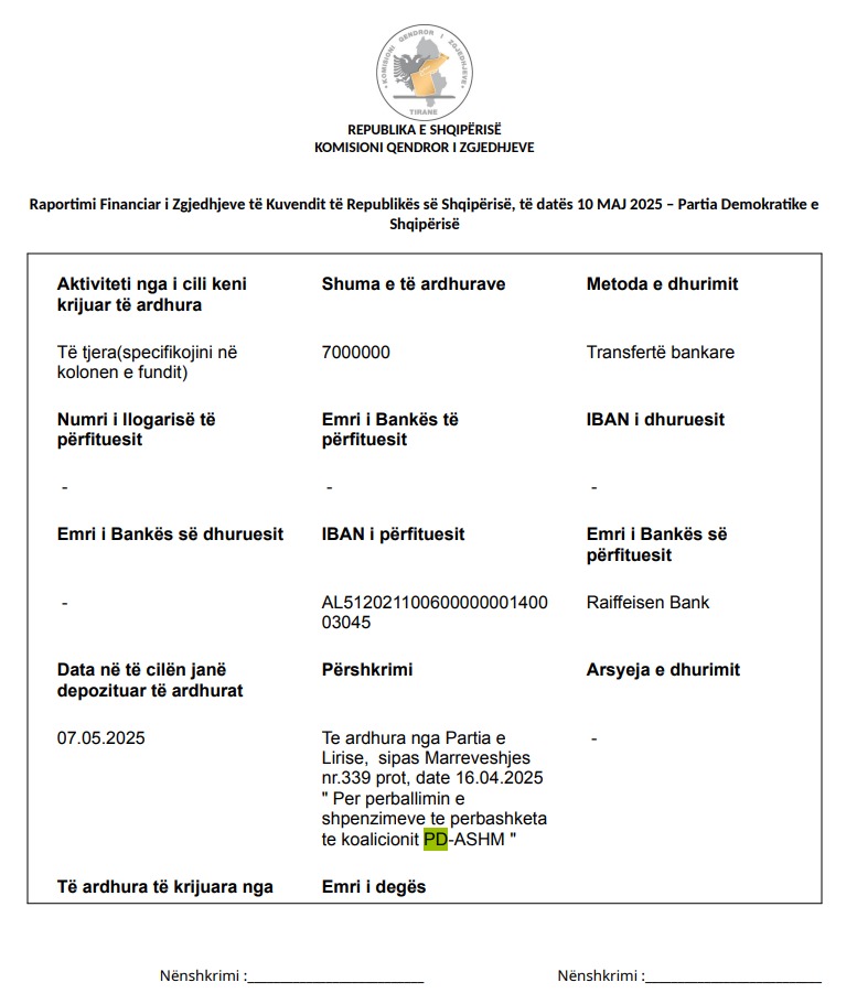 7.000.000 lekë të likuiduara më 08.05.2025, përmes Bankës Credins, nga fondet e fushatës zgjedhore, dhe të pasqyruara në raportin financiar të zgjedhjeve.