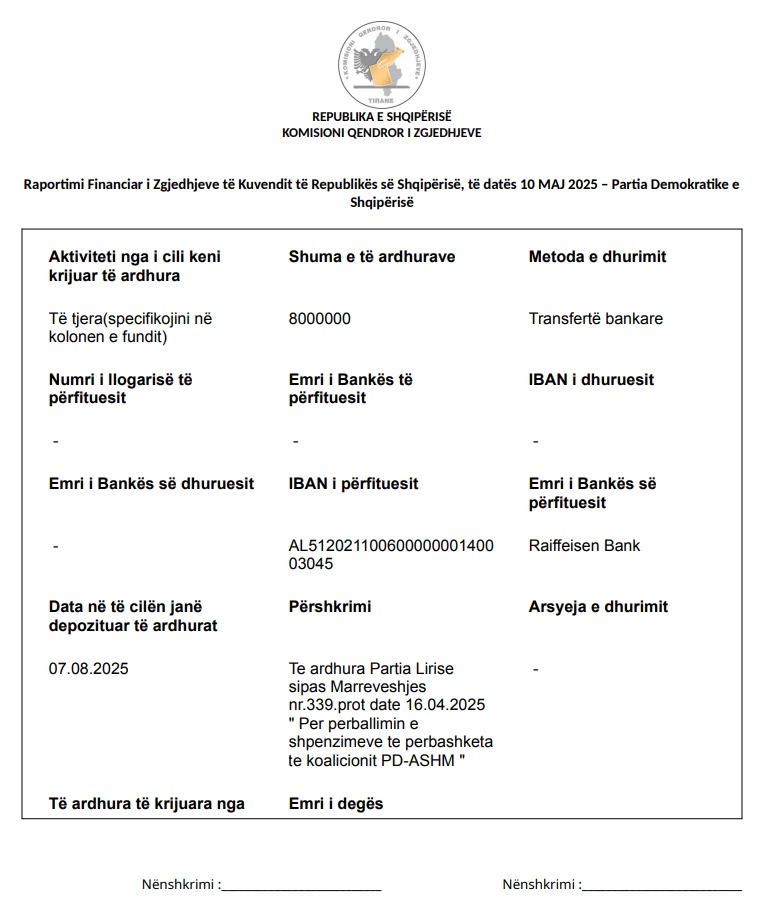 8.000.000 lekë të likuiduara më 26.08.2025, sipas detyrimit të përcaktuar në marrëveshjen e koalicionit shume e cila eshte marrë nga fondet e vitit te partise dhe e cila raportohet në raportin financiar vjetor të Partisë së Lirisë, ku deklarohet edhe ai zgjedhor, në përputhje me ligjin.