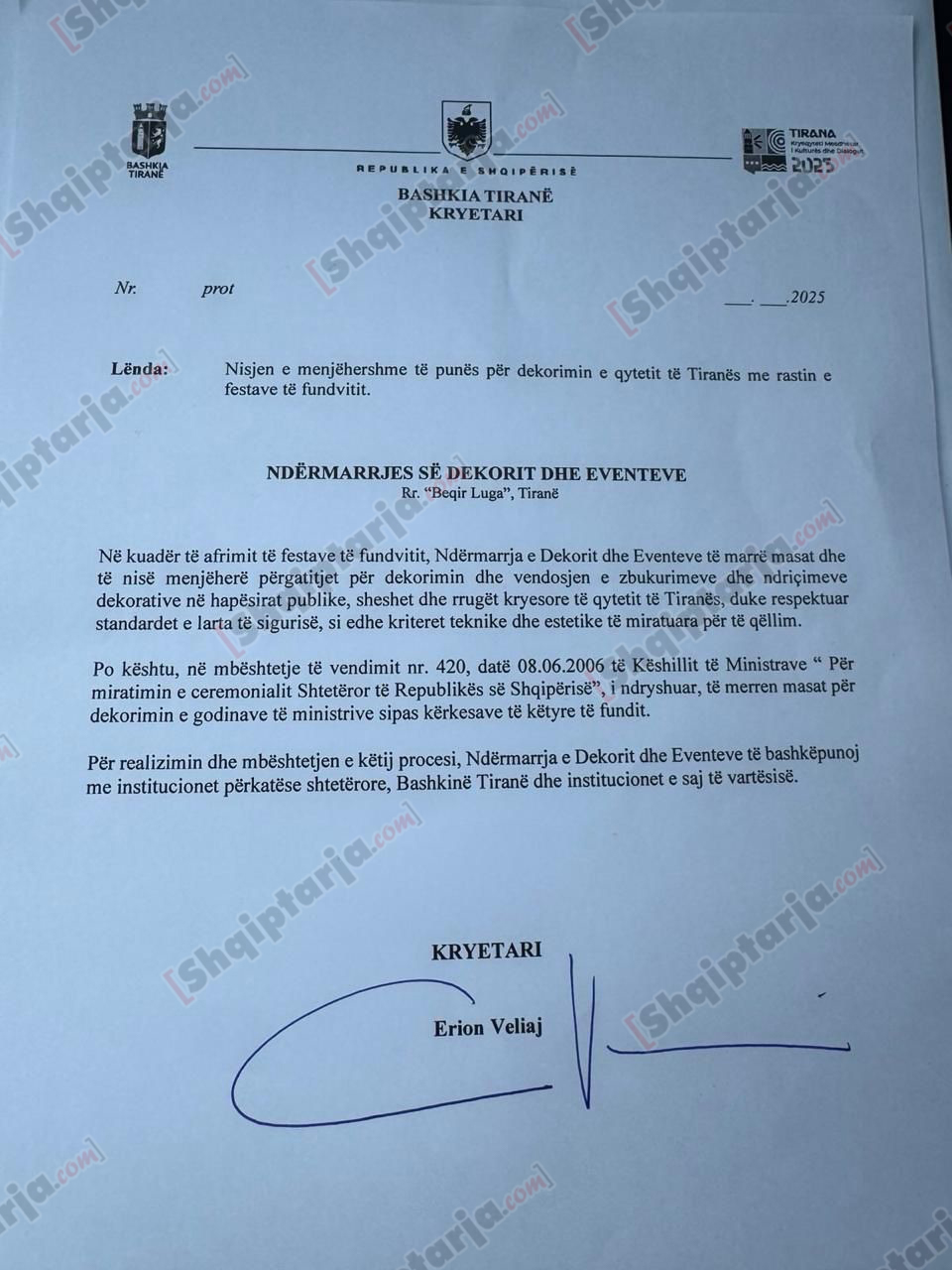 Në dokumentin dërguar Ndërmarrjes së Dekorit dhe Eventeve, të cilin Report Tv e disponon dhe mban firmën e Veliajt, thuhet se duhet të merren masat për vendosjen e ndriçimeve dhe zbukurimeve festive në sheshe, rrugë dhe hapësira publike.