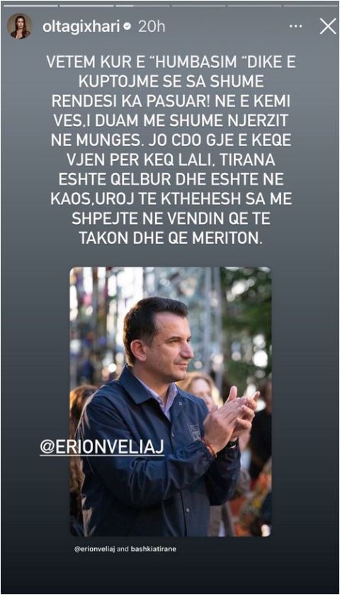 Ndër ta edhe aktorja Olta Gixhari, e cila publikoi një story në Instagram me një mesazh për kryebashkiakun, ku i thotë se ai duhet që të jetë në krye të bashkisë.