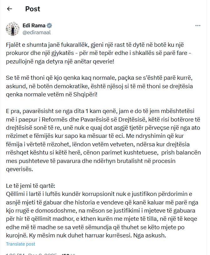 “Fjalët e shumta janë fukarallëk, gjeni një rast të dytë në botë ku një prokuror dhe një gjykatës - për më tepër edhe i shkallës së parë fare - pezullojnë nga detyra një anëtar qeverie! Se të më thoni që kjo qenka kaq normale, paçka se s’është parë kurrë, askund, në botën demokratike, është njësoj si të më thoni se drejtësia qenka normale vetëm në Shqipëri! E pra, pavarësisht se nga dita 1 kam qenë, jam e do të jem mbështetësi më i paepur i Reformës dhe Pavarësisë së Drejtësisë, këtë risi botërore të drejtësisë sonë të re, unë nuk e quaj dot asgjë tjetër përveçse një nga ato rrëzimet e fëmijës kur sapo ka mësuar të eci. Me ndryshimin që kur fëmija i vërtetë rrëzohet, lëndon vetëm vetveten, ndërsa kur drejtësia rrëshqet kështu si këtë herë, cënon parimet kushtetuese, prish balancën mes pushteteve të pavarura dhe ndërhyn brutalisht në procesin qeverisës.”, shkruan Rama.