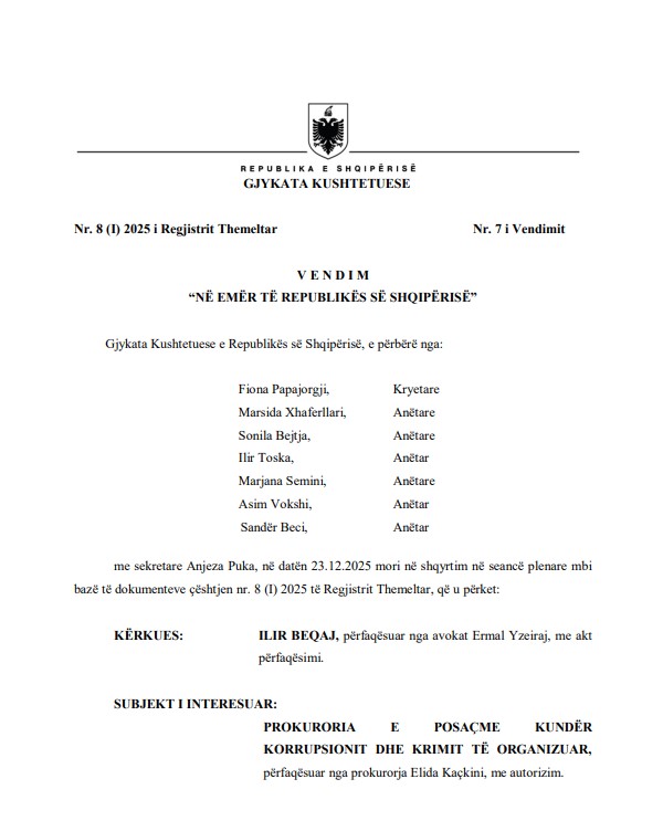 Në këtë konkluzion ka arritur Gjykata Kushtetuese, e cila më 28 janar rrëzoi kërkesën e Beqajt për shfuqizimin e masës “arrest në burg”, të cilën e vuan prej 4 korrikut 2024 në paraburgimin e Durrësit.