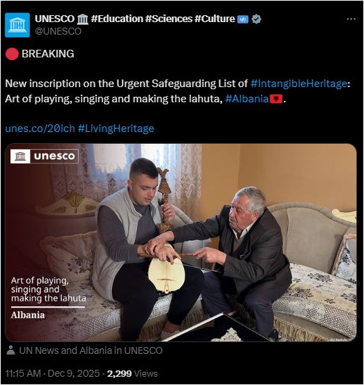 “Një regjistrim i ri në listën për nevojë urgjente mbrojtjeje. Arti i të luajturit, të kënduarit dhe të punuarit të lahutës”, shkruhet në njoftimin e vetë Unescos, shoqëruar dhe me foton e një të riu që po merr mësime se si të luajë këtë instrument.