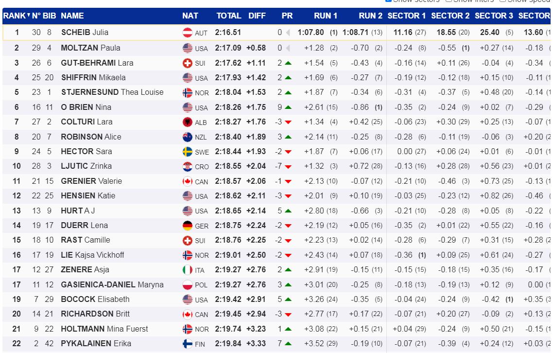 Vendi i parë u sigurua nga austriakja Julia Scheib me kohën 2 minuta 16 sekonda e 51 të qindtat, ndërsa në podium u ngjitën edhe amerikania Paula Moltzan dhe zvicerania Lara Gut-Behrami (bashkëshortja e ish-futbollistit shqiptar Valon Behrami). Në vendin e katërt u rendit 'mbretëresha' e kësaj disipline, amerikania Mikaela Shiffrin që ka 101 fitore në Kupën e Botës dhe dominon prej 13 vitesh.